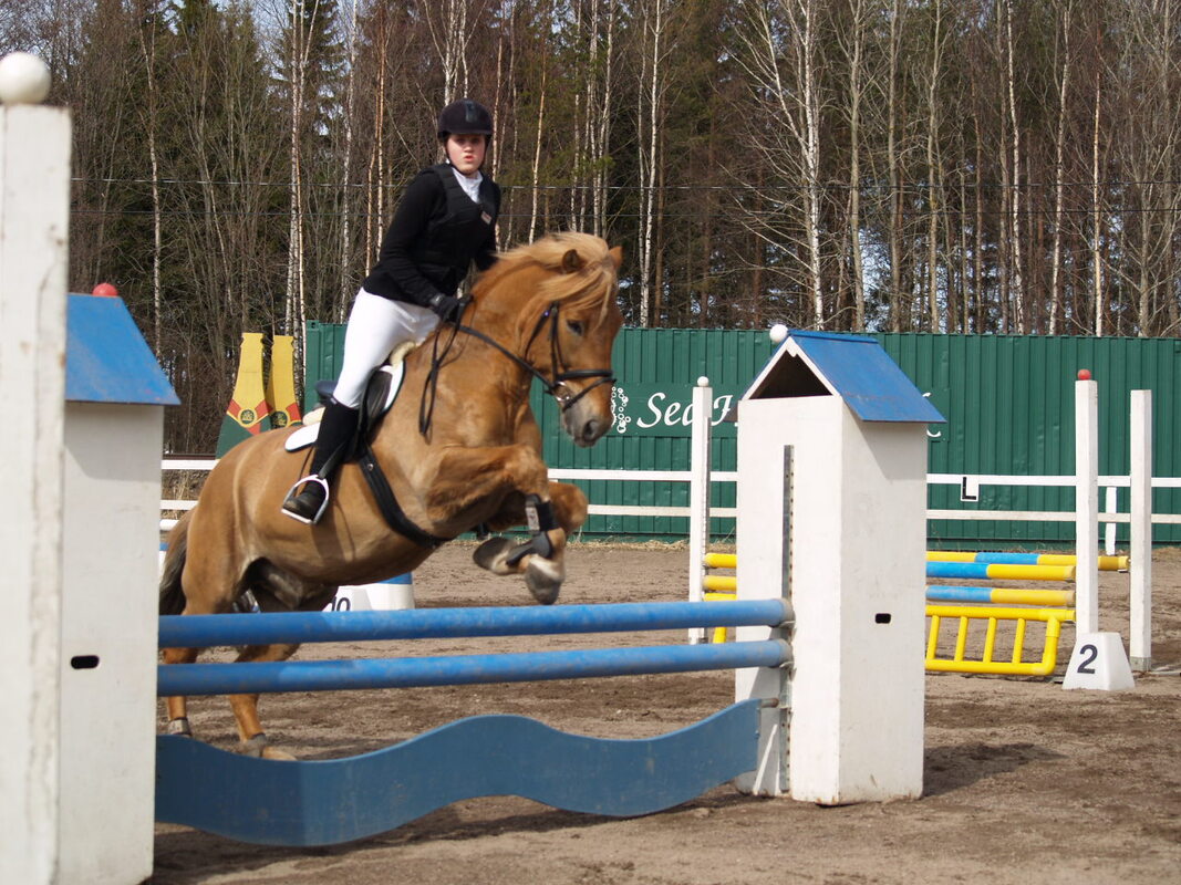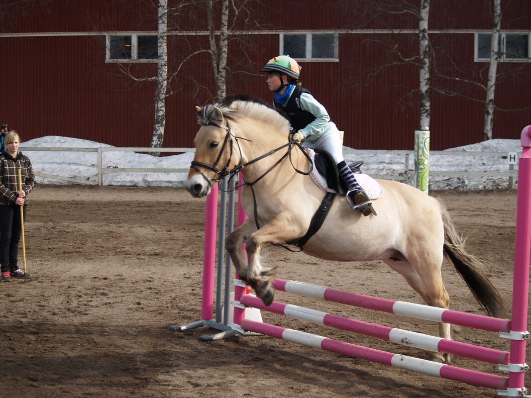 TULOKSIA VIIKONLOPUN RATSASTUSKILPAILUISTA Seuratason esteratsastuskilpailut Hangossa sunnuntaina 17.4. Talvi on taittunut ja Hankoniemen ratsastajain tallilla Hangon Suursuolla kilpailtiin ensimmäistä kertaa tällä kaudella ulkokentällä, upeassa keväisessä säässä! Lajina oli tällä kertaa esteratsastus ja seuratason kilpailussa luokkia ratsastettiin kaikkiaan kolme. Luokan I, 60 cm, voiton vei hankolainen Rebecca Sandberg ratsulla Priska. Niin ikään Hankoon meni II-luokan, 80 cm, voitto - Gabriella Ahlvik ja Dollar II päihittivät toiseksi tulleen Jessica Holmin vain 0,18 sekunnin erolla! Sunnuntain kolmannessa luokassa estekorkeus oli 80/90/95 cm ja sinivalkoinen voittorusetti ojennettiin tiukan kilpailun jälkeen Billnäsin ratsastajien Felicia Heleniukselle ja Hjördis frá Kveikjalle.