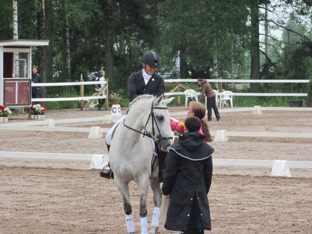 Hankoniemen ratsastajain Janina Laineen hieno kisavire jatkui Ypäjän kisaviikolla sekä este- että kouluradoilla. Torstaina 13.6. Laine osallistui aluetason estekilpailuihin Dollar II -ponilla ottaen luokkavoiton 80 cm poniluokassa. Torstain toinen rusetti napsahti puolestaan kouluratsastusareenalta, jossa Laine osallistui Rico Ibericon kanssa ensimmäistä kertaa kansallisen tason kilpailuun. Junioriderbyn ensimmäisen osakilpailun, Helppo A-tasoisessa luokassa, tulos 64,569% toi ratsukolle hienon neljännen sijan! Kärkiratsukoiden osalta tasaisen luokan voitti Hyvinkään Ella Paloheimo (Orchid's Imeranda) prosentein 66,379. Perjantaina ratsastettu Junioriderbyn toinen osakilpailu, Helppo A-tasoinen sekin, oli niin ikään kärjen osalta tasainen. Tuloksella 61,667% sijoittui Janina Laine (Rico Iberico) sijalle 8. Luokkavoiton ratsasti Ypäjän Matilda Silvo (Mardi Gras) prosentein 65,208. Yhteistuloksella 126,236 oli pari Janina ja Rico Junioriderbyn neljäs! Derbyvoiton vei Hyvinkään Ella Paloheimo (Orchid's Esmeralda) tuloksella 129,921. Ratsukko osallistui perjantaina myös aluetason Helppo B:3 -luokkaan, joka olikin parivaljakon juhlaa. Huikeat prosentit 68,750 toivat selvän luokkavoiton!