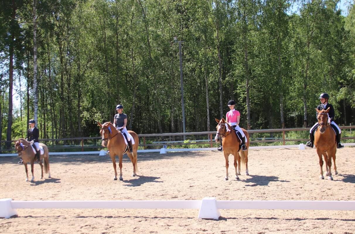 Kevät on haastava kaikille, niin myös ratsastuskoululle. Olemme kuitenkin päässeet pyörittämään ratsastustunteja pienin muutoksin. Kilpailutoiminta jouduttiin keskeyttämään ja kilpailuja perumaan, ei vain meillä vain koko maassa. Aika käytettiin hyödyksi ja treenaus kotona jatkui sujuvasti. Kesäkuussa saimme vihdoin mahdollisuuden jatkaa kilpailukautta ja järjestimme seuratason koulu- ja esteratsastuskilpailut. Ensimmäisenä lauantaina 13.06. pystytettiin kouluaidat ratsastuskoulun kentälle. Luokkia järjestettiin kolme. Tuomariksi suorituksia arvioimaan saapui Hanna-Mari Selcuk. Ensimmäinen luokka oli Helppo C EB Special 2015. Luokkaan osallistui yhdeksän ratsukkoa. Luokan voittoon ratsasti Minna Oinonen (Simberg High D 93 W, HunR) keräten 142,5p ja 67,857%. Toiseksi ratsasti Ritva Purola (Sävel-Saittara, HunR) pistein 139,5 ja 66,429%. Kolmannen sijan jakoivat Eerika Veikkolainen (Vipper, HunR) ja Emmi Himmelroos (Lennon Loiste, V-NR), he keräsivät saman verran pisteitä eli 139p ja 66,190%. Luokka oli samalla Hankoniemen Ratsastajia edustavien junioriratsastajien kesken kilpailu PRIX DE CUBA CALLE- kiertopalkinnosta. Tämän kiertopalkinnon tänä vuonna nimiinsä voitti Eerika Veikkolainen, Onnea! Toinen luokka ratsastettiin Helppo B- tasolla, ohjelmana Helppo B:3 2019. Tässä luokassa parhaimmat pisteet keräsi nimiinsä Johanna Kemppainen (Riikuri, HunR). Luokkavoitto irtosi prosentein 65,455%. Toisen sijan jakoivat Miina Lähdeniemi (Erne Valley Midir, HunR) ja Martha Lehtonen (Vision Seventh Brother, HR) prosentein 65,00%. Kolmas ratsastettava luokka oli niinikään tasoltaan Helppoa B:tä, mutta ohjelma vaihtui hieman vaativammaksi. Luokassa nähtiin seitsemän ratsukkoa ja näistä parhaiten pisteitä keräsi jo kerran palkintojenjaossa käväissyt ratsastaja Minna Oinonen ponillaan Voore Aurum. Pisteitä ratsukolle kertyi 174,5 ja prosentteja 67,115. Toiselle sijalle ratsasti Veera Holmström (Saffrons Musical, V-NR) pistein 170 ja prosentein 64,885.