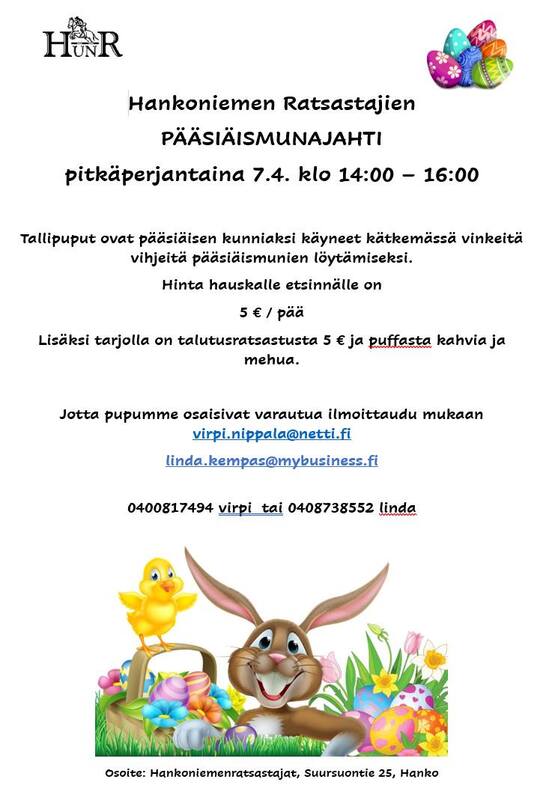Hankoniemen RatsastajienPÄÄSIÄISMUNAJAHTIpitkäperjantaina 7.4 klo 14.00 - 16.00Tallipuput ovat pääsiäisen kunniaksi käyneet kätkemässä vinkeitä vihjeitä pääsiäismunien löytämiseksi.Hinta hauskalle etsinnälle on 5€ / hlö.Lisäksi tarjolla talutusratsastusta 5€ ja puffasta kahvia ja mehua.Jotta pupumme osaisivat varautua, ilmottaudu mukaanvirpi.nippala@netti.fi ,0400-817494 tai linda.kempas@mybusiness.fi , 040-8738552